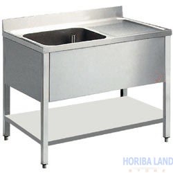 Lavello inox per la ristorazione Realizzato in acciaio inox 18/10 AISI 304 spessore 12/10 mm, sgocciolatoio destro, ripiano inferiore, piano superiore battuto, alzatina posteriore da 85 mm, dimensione vasca 400x500xh275, fondo esterno della vasca rivestito di un isolante acustico, piletta e troppo pieno, piedini regolabili in acciaio